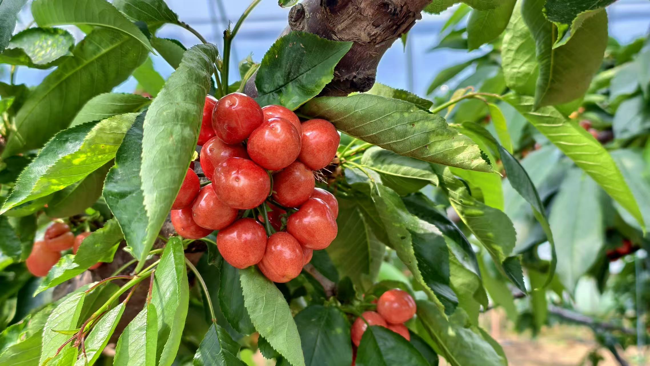 近日,走进枣庄市薛城区邹坞镇云品产业园的温室大棚,仿佛置身一片甜蜜丰收的天地。浓郁的果香与丰收气息扑面而来,圆润饱满的樱桃缀满枝头,在阳光映照下色泽鲜亮、格外诱人。