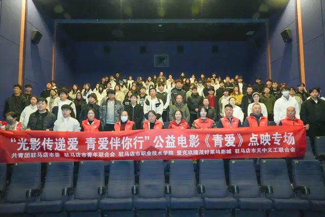 11月21日上午,中国首部青少年艾滋病防治公益电影《青爱》在驻马店市举行首映活动。驻马店市天中义工联合会志愿者、驻马店职业技术学院师生代表共同参与,共青团驻马店市委副书记胡涛、驻马店市疾控中心科长龚涛、驻马店职业技术学院学工部部长安运银、驻马店职业技术学院团委副书记姚江帆、驻马店市天中义工联合会会长李娟出席活动,以光影为媒传递防艾教育正能量。