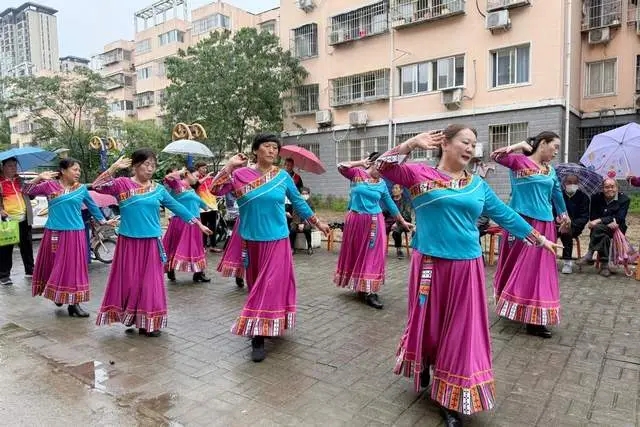 绵绵秋雨阻挡不住大家传递关怀的热情。活动现场,天中义工们精心准备了优美的舞蹈表演。舞者们身着盛装,踏雨旋转、跳跃,欢快的舞步、灵动的身姿传递出对生活的热爱和对祖国的赞美。社区居民围坐一起,撑伞凝望,不时发出阵阵掌声与喝彩声。载歌载舞的热闹场景,让安居新村充满了欢声笑语。