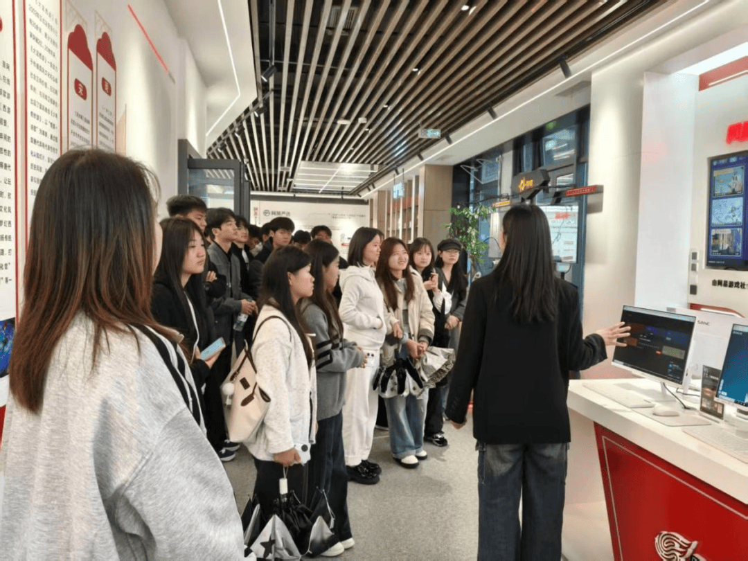在网易(驻马店)联合创新中心,企业工作人员带领大家深入参观企业展馆,通过实物展示、互动体验、案例讲解详细介绍了网易在数字技术研发、互联网产品创新、区域产业赋能等领域的核心成果,工作人员的细致讲解让同学们对企业的技术迭代与创新模式有了全新认知。