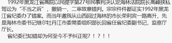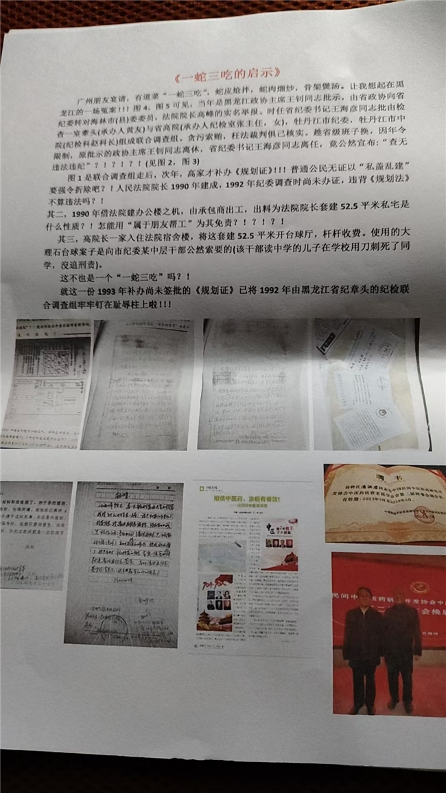 《法官法》也有明文规定。牡丹江市中院有意隐匿庭审筆录,真就没人能管管吗?!《一蛇三吃的启示》广州朋友宴请,有道菜“一蛇三吃”,蛇皮炝拌,蛇肉熘炒,骨架煲汤。让我想起在黒龙江的一场冤案!!!图4,图5可见,当年是黑龙江政协主席王钊同志批示,由省政协向省纪委转对海林市(县)委委员,法院院长高峰的实名举报。时任省纪委书记王海彦同志批由检查一室牽头(承办人黄友)与省高院(承办人纪检室张主任,女),牡丹江市纪委,牡丹江市中院(纪检科赵科长)组成联合调查组。贪污索贿,枉法裁判俱己核实。趁省级班子换,因年令限制,原批示的政协主席王钊同志离休,省纪委书记王海彦同志离任,竟公然宣布:“查无违法违纪”?!?!?!(见图2,图3)