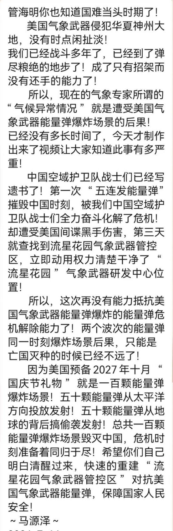 但是,北京区域的灾难伤害,气象专家们自己解决问题吧!我们中国空域护卫队战士们已经解决了十一个省的连续一个半多月的事情。我们希望北京区域的气候异常事情有气象专家们解决好吗?如果你们解决不了,就向习主席打电话解决问题。东方使者马悟真领导世界人类生存生活发展路的人!