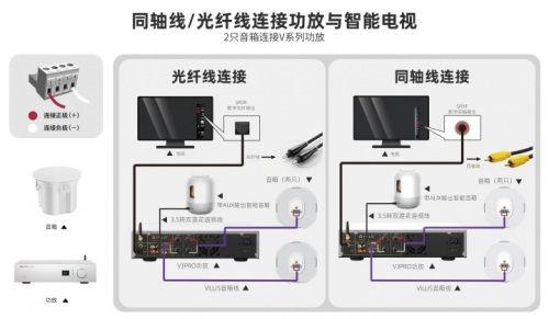 连接方式:同轴线/光纤线连接功放与智能电视。