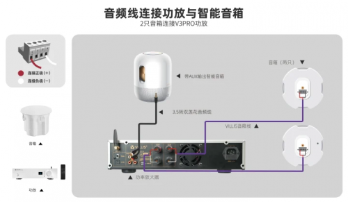 连接方式:音频线连接功放与智能音箱。