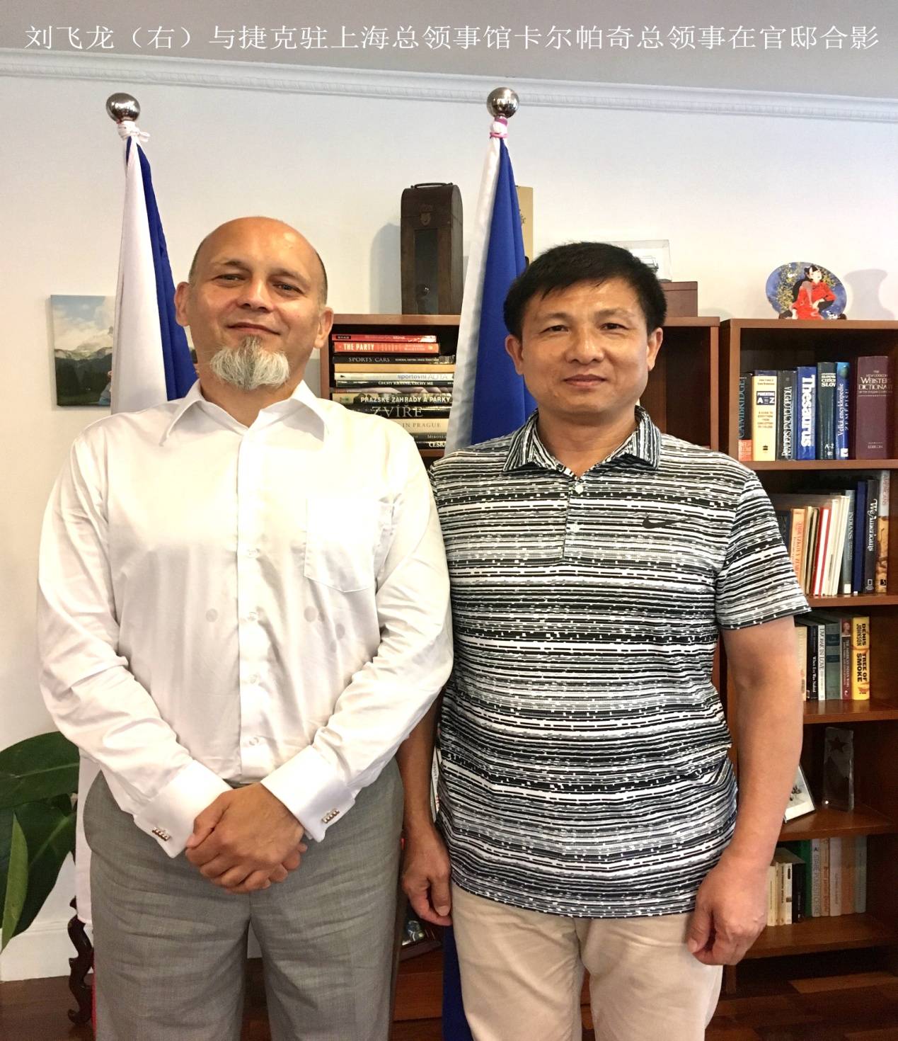 上海创韵文化传播有限公司总经理刘飞龙先生与捷克驻上海总领事馆卡尔帕奇总领事在总领事官邸的亲切合影,象征着民间机构与外交部门为共同目标建立的高效协作。