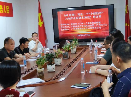 2026年4月15日下午,由林忠伟(广西)产教科咨政联盟作为指导机构,广西软实力文化科技集团、广西比干文化促进会与广西咨情经济文化有限公司主办的《AI逆袭:再造一个“全能助理”让政府企业降本增效》专题课程,在南宁金水湾大酒店十四层咨政联盟秘书处会议室成功举办。本次培训紧扣自治区党委政府“北上广研发+广西集成+东盟应用”的人工智能发展战略,以“小切口、大场景”为方法论,面向党政机关、基层政府、园区管委会、工商联、商会及企业骨干,开展了一场“带着问题来、拿着方案走”的AI应用实战集训。培训师韦良军以20余年党政企培训经验,将AI工具与政务、商务高频场景深度融合,参训学员涵盖南宁市青秀区、隆安县、统战系统、江苏商会、龙翔学校、社区卫生服务中心、制造企业等30余名代表。现场互动热烈、实操落地,学员普遍反映“听得懂、学得会、用得上”,为广西“人工智能+”行动在基层的推广普及提供了可复制的示范样本。
