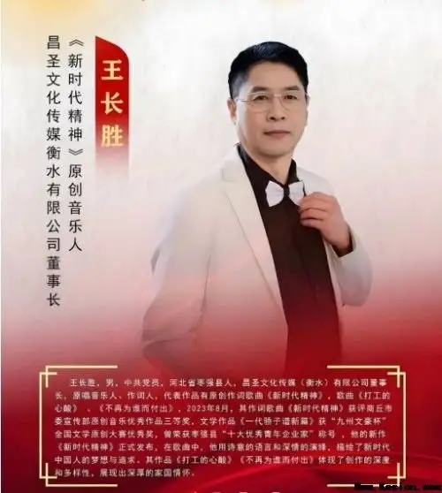 原创作品绽放多元魅力 王长胜的音乐创作涵盖生活感悟与时代主题,代表作除广为人知的《新时代精神》外,《打工的心酸》《不再为谁而付出》等作品也以细腻的情感刻画引发听众共鸣。文学领域同样有他的身影,散文《一代骄子谱新篇》获“九州文豪杯”全国文学原创大赛优秀奖,展现了他跨领域的创作才华。 《新时代精神》:一曲唱响家国情怀的时代强音 2023年8月,其作词歌曲《新时代精神》成为现象级作品,先后获评商丘市委宣传部原创音乐优秀作品三等奖、中央电视台少儿影视城“季季精彩”迎春晚会最佳声乐类表演金奖,登上华夏之星百姓大舞台新年演唱会、凤凰卫视《天南地北大联欢》栏目,并入选广东省宣传部“我们的新时代”原创作品征集活动优秀作品。2025年9月,该歌曲更入选“新时代文艺作品选”,成为传递时代精神的文化符号。