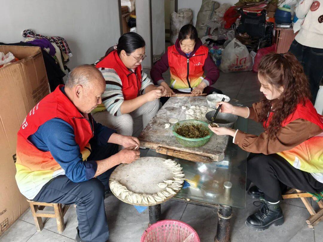 除物质帮扶外,义工们更注重与老人建立情感联结。他们围坐老人身边,倾听其人生故事,记录生活需求,并通过“忆往昔”“谈变化”等互动话题,帮助老人缓解孤独感。在杜新忠家,义工与老人共同包饺子。大家分工协作,揉面、调馅、包捏,欢声笑语中传递着浓浓温情。