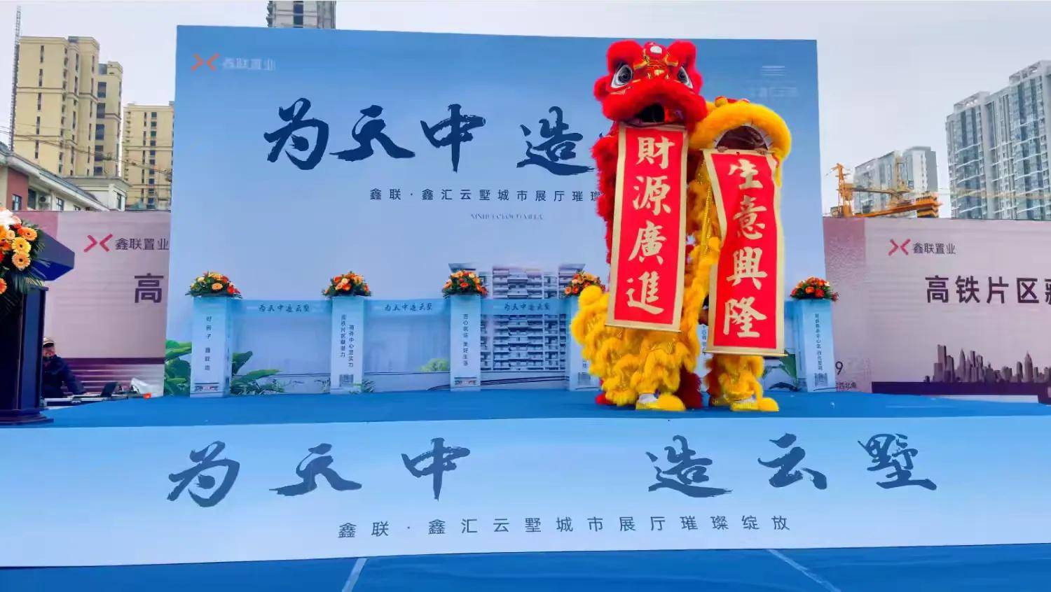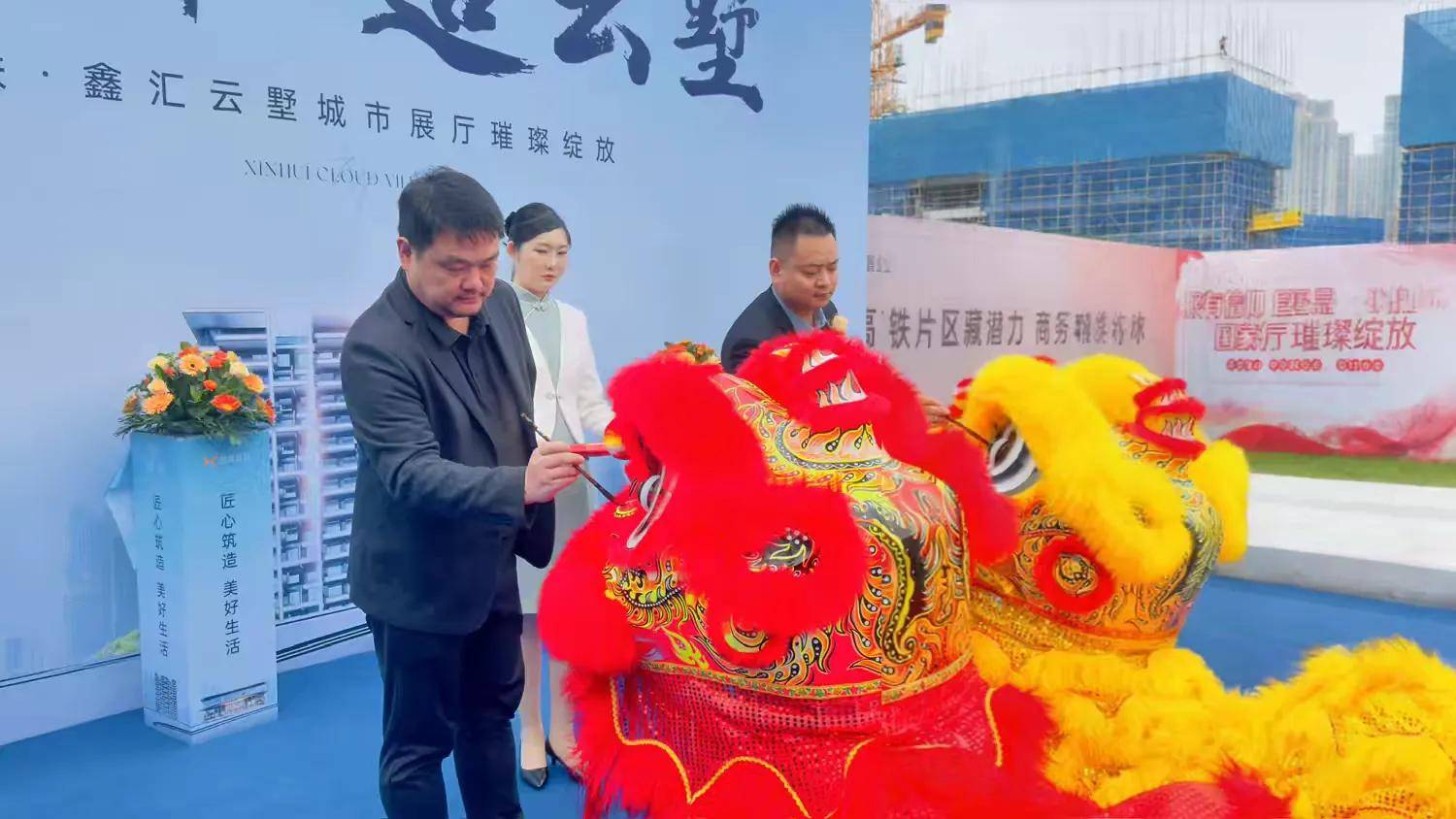 雄狮献瑞,迎祥纳福。马小东总经理与李伟总监共同共同为祥狮点睛。在点睛仪式后,雄狮苏醒,带领各位领导嘉宾步入展厅进行采青,并开启了象征财富与机遇的展厅大门,寓意着鑫联·鑫汇云墅开门纳福,广迎八方宾客。