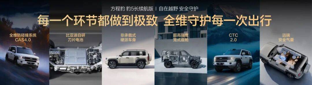 豹5搭载“天神之眼”辅助驾驶系统/华为乾崑智驾ADS 4,设计全维主动安全并标配五大被动安全:790mm涉水深度、13吨顶压承重、61%高强钢车身+19%热成型钢、100%高强钢车架(扭转刚度较燃油架构提升44%)、5层防护电池包及11个安全气囊(含远端气囊),驾乘守护全面升级,是智能硬派,更是安心的家。