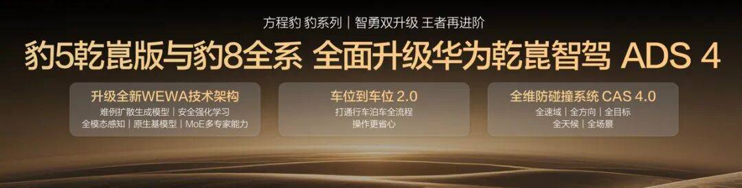 豹5乾崑版及豹8全系将升级华为乾崑智驾ADS 4,实现了从类人驾驶到超人驾驶的重大升级。首先,升级全新WEWA技术架构,让辅助驾驶可以云端自主学习进化,越用越丝滑;车位到车位功能也升级至2.0版本,打通了行车到泊车的全流程,全程衔接无缝,操作更省心;此外,还有全维防碰撞系统CAS 4.0,可以覆盖全路况、全天候,安全制动更快更灵敏,让长途驾驶不再疲惫,让城市通勤安全又轻松。