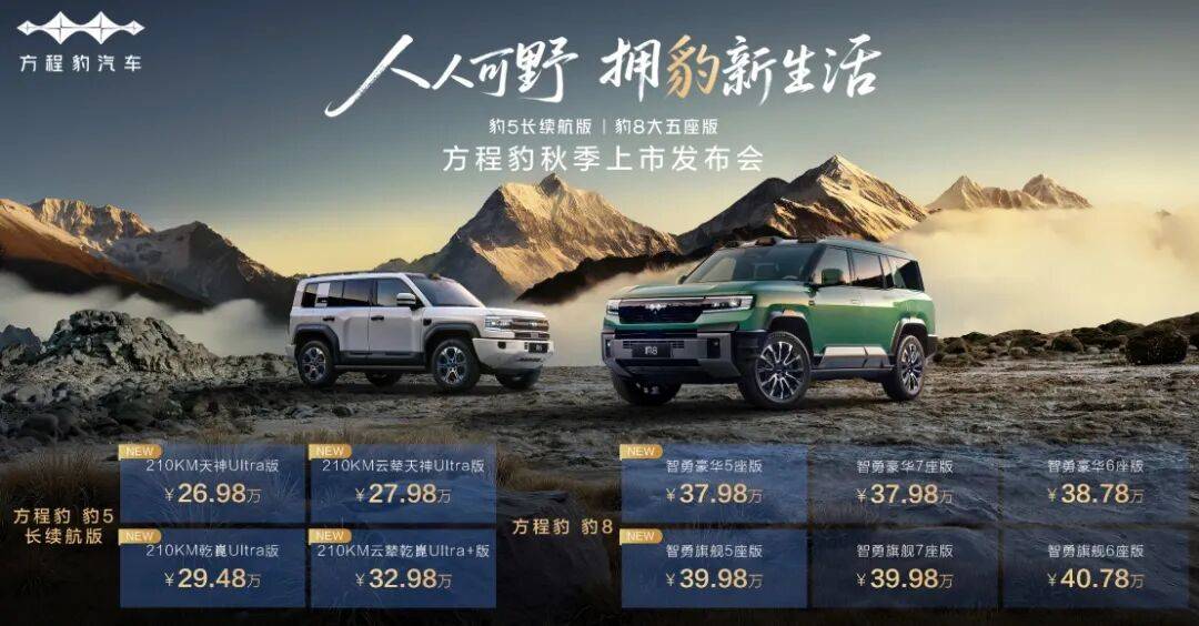 10月20日,方程豹以“人人可野·拥豹新生活”为核心主张,“豹5长续航版”焕新上市,价格26.98-32.98万元;豹8大五座版加推上市,价格37.98-40.78万元。本次方程豹豹系列产品,实现了DMO平台的DMO+升级、华为乾崑智驾的ADS 4升级、以及比亚迪智慧生态等多项顶级核心科技的全面升级,并带来续航、安全、舒适、操控等全维度的系统性优化。