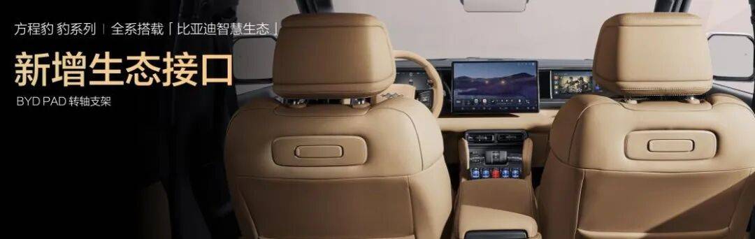 豹5长续航版、豹8大五座版上市即搭载钛7同款比亚迪智慧生态,通过生态设备的“全能管家”比亚迪智慧物联APP,无需复杂操作,也不需要手动连接多个设备,语音指令即能控制全车所有的生态产品。此外,两款新车型的前排座椅背后均加装了生态接口,插入转轴支架后,可以搭配BYD Pad使用。未来将有更多的生态产品,通过生态接口提供用户以智慧互联的无限体验。