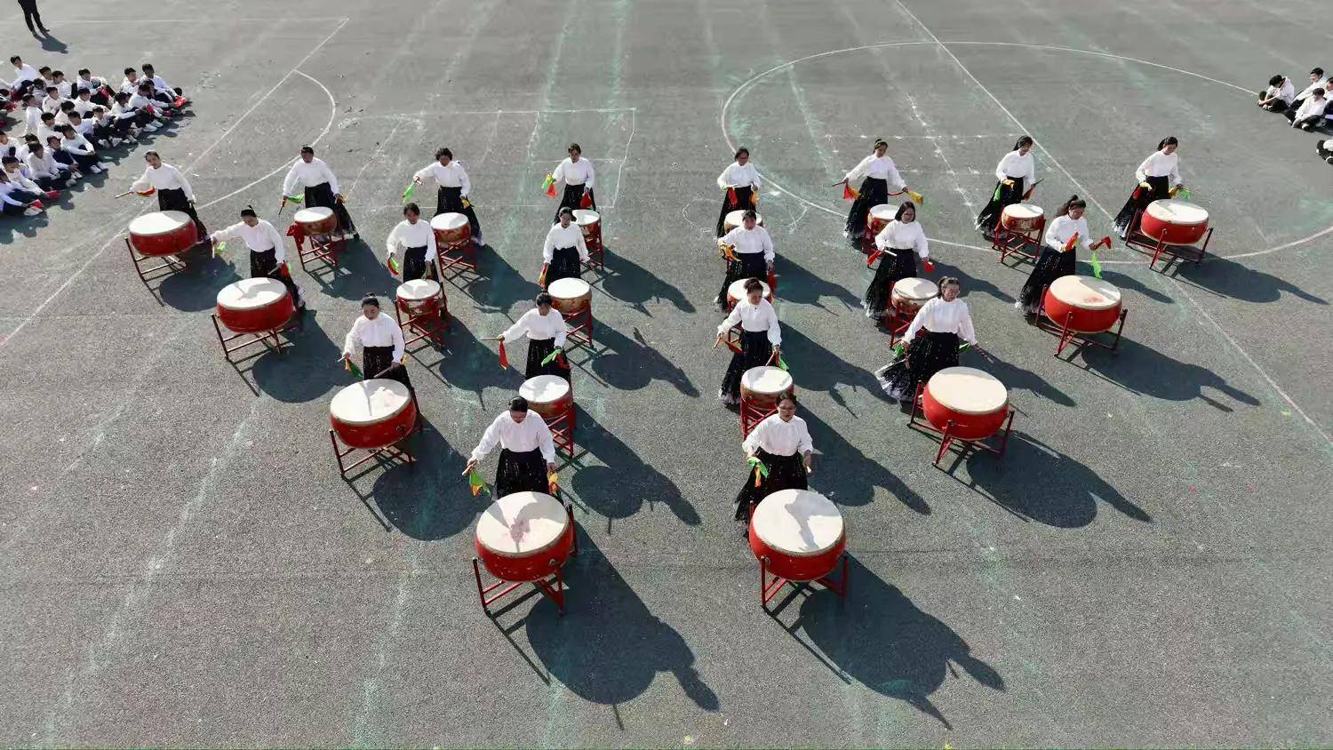 宣誓环节结束后,开幕式的团体操表演将现场气氛推向高潮。首先登场的是教师盘鼓表演《精忠报国》,随着音乐的节奏敲击着盘鼓,鼓声震天,气势磅礴;七年级学生带来的武术操《梦想启“武”》动作整齐划一,刚劲有力,一招一式都展现出了少年的阳刚之气,充分体现了中华武术的魅力。