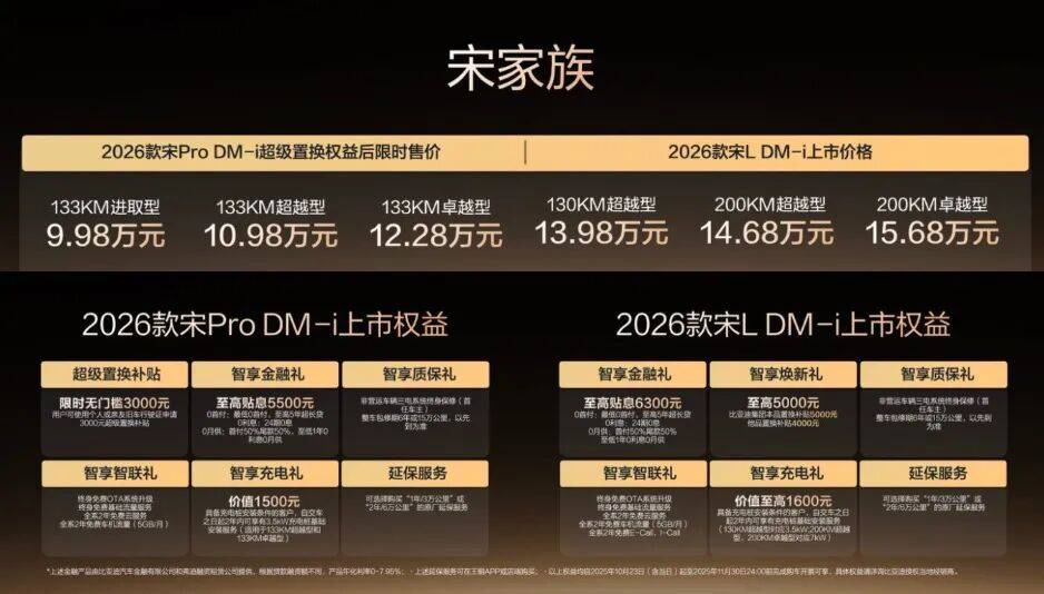 10月23日,比亚迪宋家族迎来重磅焕新,2026款宋L DM-i/宋Pro DM-i双车同步上市,限时售价9.98-15.68万元起。其中,2026款宋L DM-i售价13.98-15.68万元,2026款宋Pro DM-i超级置换权益后,限时售价9.98-12.28万元。同时,两款车型均带来了丰厚的上市权益礼。