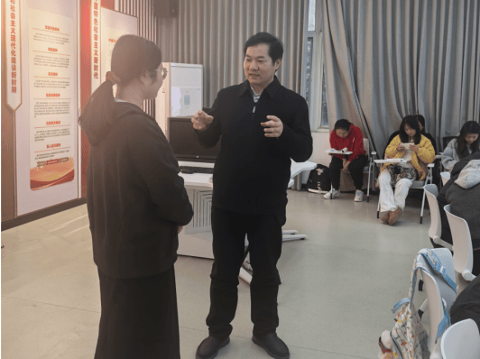 11 月 6 日下午,驻马店职业技术学院校党委书记苏新留深入教学一线,实地调研思政课教学开展情况,随机听取了马克思主义学院杨朵老师主讲的《道德与法治》课程,并在课后与同学们面对面交流,引导青年学子坚定理想信念,明确时代使命。 课堂教学环节,杨朵老师围绕“个人梦想与中国梦的内在联系”“新时代青年的使命担当”两大核心议题展开教学。授课过程中,杨老师紧密结合当前时事热点与典型人物事迹,通过理论深度阐释、课堂互动提问等多元化教学方式,系统引导同学们深刻领会中国梦的丰富内涵与实践要求。其教学语言精准生动,逻辑架构清晰递进,课堂氛围浓厚有序。