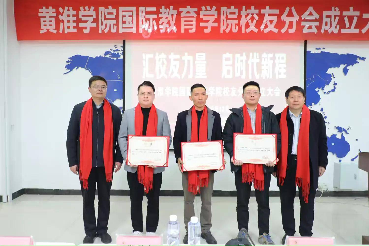 黄淮学院校企合作与校友工作处处长、校友会会长张得生,黄淮学院国际教育学院院长王保宇为国际教育学院校友分会新当选负责人颁发聘书。