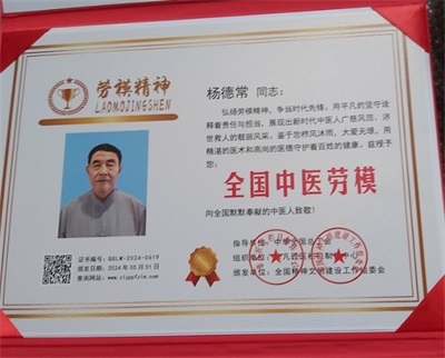 杨德常教授凭借着其杰出的医学成就和卓越的学术贡献,荣获了多项荣誉和称号,先后被授予;国医大师、中华名医、榜样中国我心目中的名医、当代中华十大国医名师等荣誉称号。2023年中国科学家年鉴以岁序更替,华章日新收录《大健康守护者杨德常》,这是对他医术的极高认可,2024年荣获全国中医劳模。这些荣誉的获得不仅是对他个人医学水平的肯定,也是对他多年来在医学领域做出的杰出贡献的认可和褒奖。他的专业贡献和荣誉不仅为医学界树立了榜样,也为人类健康事业的发展作出了突出的贡献。