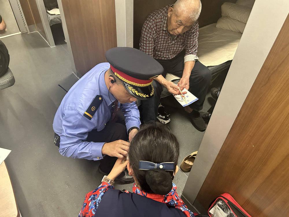 2025年12月7日,郑州客运段深圳车队D148次列车惠州站至赣州站区间内,四号车厢乘务员张益博紧急呼叫桑永刚列车长,说是位年长的旅客,手指一直在流血。旁边老伴急得直抽纸巾,可那殷红的血还是从手指缝里往外渗,滴答滴答落在地上。 桑永刚列车长收到呼叫立即赶往四号车厢,并呼叫红十字救护员王亚楠,拎着个急救药箱,小跑着穿过过道赶了过来。桑永刚列车长半蹲在老先生旁边,嘴里安慰着老先生,并查看伤口情况。红十字救护员王亚楠也立即打开药箱。动作很轻,但很利索。她先是用好几根棉签,小心翼翼地擦掉伤口周围的血,那血一下子又把棉签头浸透了,看着伤口确实不浅。她一边擦,一边温和地问:“您是怎么划着的呀?”老先生疼得眉头皱着,一旁的老伴说到:“翻包时,没有注意那个剃须刀的刀片,他一摸,就……”