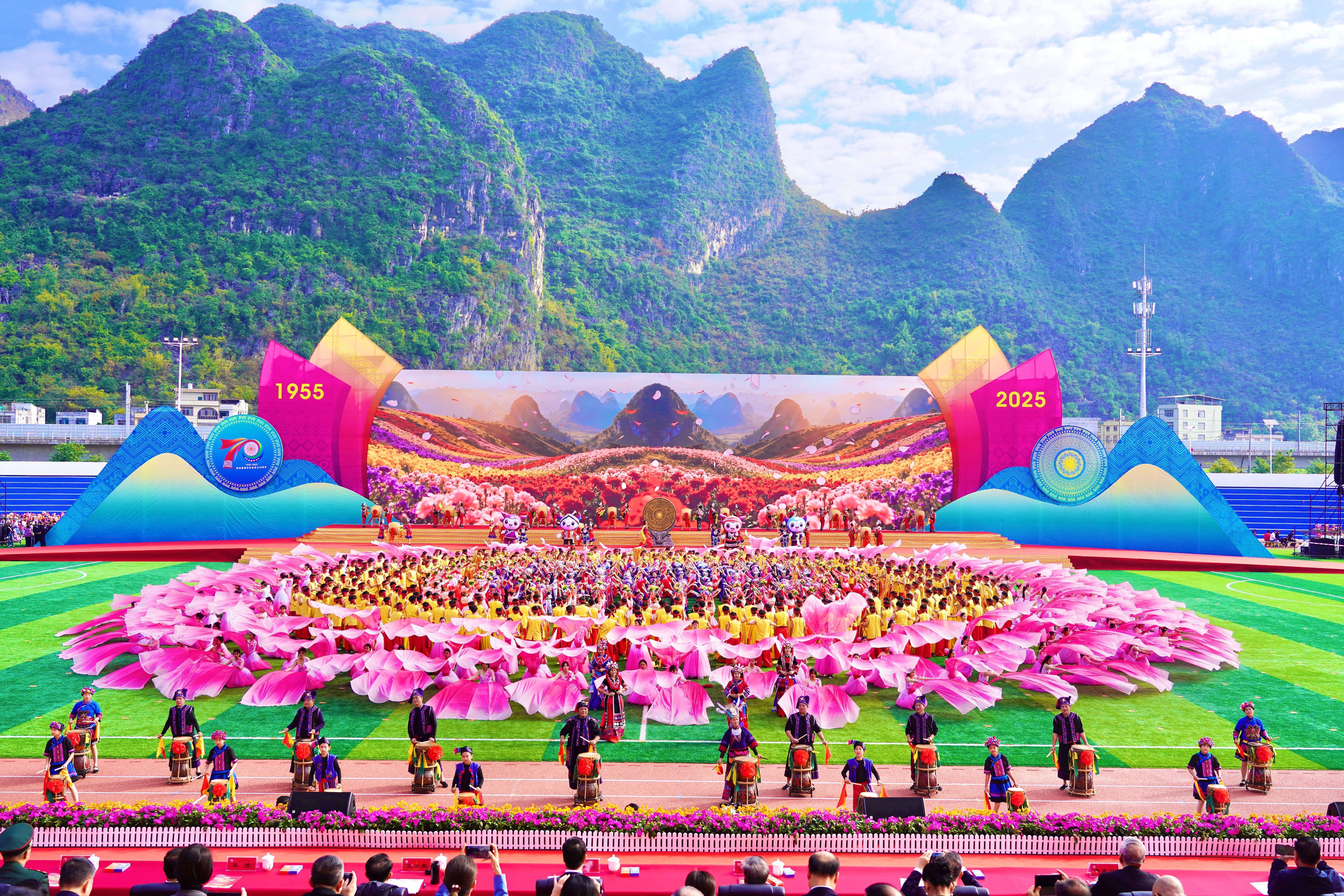 12月15日上午,都安瑶族自治县举行庆祝大会、群众文艺展演、成就展等活动,喜庆自治县成立70周年,全方位展示都安经济社会发展成就。全国人大民委、国家民委祝贺团团长,国家民委教育司副司长王学荣;自治区代表团团长,自治区党委常委、统战部部长谭丕创;自治区代表团副团长,自治区人大常委会副主任刘有明、自治区副主席蓝晓、自治区政协副主席黄俊华、广西军区少将副司令员杨猛;市代表团团长,市委书记秦春成,市委副书记、市长王军;市代表团副团长,市政协主席黎丽等出席相关活动,与都安各族干部群众共同欢庆盛会。
