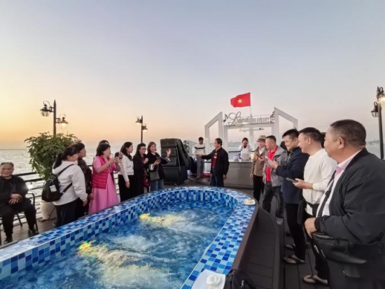 下龙湾上千帆竞 溶洞钟乳话千年 12月15日,代表团乘船游览越南下龙湾,在“千峰待驭、舟阵暾新”的壮美中,感受自然的鬼斧神工与人文的深厚积淀。 “轻舸浮黛,笠影摇樽。” 船行碧波上,渔人戴斗笠、撒渔网,动作娴熟如诗。那斗笠下的笑脸,是越南人民对生活的热爱;那渔网中的银鳞,是大自然对勤劳者的馈赠。中方代表尝试亲手捕捞,一网下去,银鳞翻涌,欢声笑语洒满江面。越南渔民笑道:“这网里捞起的不仅是鱼,更是中越人民的友谊!愿我们的友谊像这渔网一样,越织越密,越捞越丰!” “岩骨凝魄,洞府深扪。” 探访溶洞时,钟乳石如凝固的乐章,垂落千年。越南导游讲述传说:“这些钟乳是大地的心跳,每一滴水珠落下,都是时间的低语。”中方学者感慨:“自然如此,文化亦然。中越文化如这钟乳,虽历经岁月,却愈发璀璨。我们应像保护钟乳一样,守护好两国文化的根脉,让它们在新时代焕发新的光彩。” “沙炽篝跃,鼓瑟惊魂。” 夜幕降临,沙滩篝火晚会点燃激情。越南摇滚乐队与中方歌手合唱《友谊地久天长》,火光映照下,两国青年的脸庞洋溢着青春的光芒。越南青年代表喊出心声:“愿化三春雨,长滋友谊林!让我们的友谊像春雨一样,滋润着两国人民的心田!”中方代表回应:“北仑水无界,星汉本同音!无论山高水长,我们的心永远相连!”