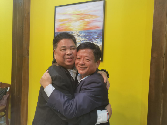 赵晓阳 韦良军 李云华 范凯华 蒋云蕙 林忠伟 中越两国山水相连、文化相近,彼此人文交流存在天然的便利条件。为进一步增强中越文化学术、企业商界和高校教育的交流。2025年12月13-16日,林忠伟(广西)产教科咨政联盟接受越南国家文联的邀请,组织专家学者、企业家百人代表团赴越南河内、下龙市、广宁省考察调研,开展中越文产教交流活动暨2026’林忠伟(广西)产教科咨政联盟年会。 2025年12月14日下午14:00,越南祖国阵线中央委员会副主席、国家文联主席(正部长级)杜红军从河内赶到下龙市,参加开展中越文产教交流活动暨2026’林忠伟(广西)产教科咨政联盟年会。刚见面,杜红军主席就紧紧地拥抱咨政联盟主席林忠伟教授,这是去年杜红军主席率领越南艺术团访问广西演出,与林忠伟主席在“桂人来”相聚言欢后与林忠伟主席再次相见,双方都感到格外亲切和激动万分。之后,杜红军主席接见了咨政联盟16位代表,就下一步中越在文化艺术、产业、教育交流合作提出了很多建设性、可操作的建议,与与会者进行有益、有效的交流,气氛友好、融洽、和谐、成效。 席间,咨政联盟工作人员与越南中方赞助企业负责人精心准备了一场中越文化交流盛宴,在杜红军主席兴高彩烈之际,播放了杜红军主席的父亲杜润1964年创作的歌曲《越南—中国》—— 越南—中国 Việt Nam Trung Hoa núi liền núi sông liền sông Chung một biển đông một tình hữu nghị sáng như rạng đông Bên sông ta cùng một dòng Tôi nhìn sang đấy anh nhìn sang đây Sáng sớm nghe tiềng gà gáy cùng A ha Chung một ý chung một lòng đường ta đi hồng mầu cờ thắng lợi A ha Nhân dân ta ca muôn năm Hồ Chí Minh Mao Trạch Đông 越南 中国 山连山 江连江 共临东海 我们友谊向朝阳 共饮一江水 朝相见晚相望 清晨共听雄鸡高唱 啊 共理想心相连 胜利的路上红旗飘扬 啊 我们高呼万岁 胡志明 毛泽东 越南 中国 团结紧 队伍强 打击敌人 我们并肩战斗有力量 兄弟情义长 前进路上不分离 为共同胜利高声歌唱 啊 共理想心相连 列宁的路上红旗飘扬 啊 我们高呼万岁 胡志明 毛泽东 我们高呼万岁 胡志明 毛泽东 这首歌曲《越南—中国》几十年来,在中越两国人民广为传唱,影响很大。 杜红军主席听到这首歌响起的时候,激动地站起来,拍起双手高声跟唱,一时间,全场百人高声齐唱,整个场面震憾环绕、激情澎湃......歌毕,杜红军主席落坐时还不停地用右指边轻轻敲打桌面边唱这首闻名中越的名曲,他万分激动的表情令人动容、感同身受。 当晚21:30,杜红军主席一行赶回河内,临走时,杜红军主席与林忠伟主席再次紧紧拥抱,这一抱,抱出中越文产教交流合作彩霞满天!
