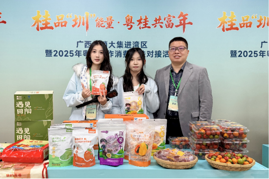 12月30日,赵晓阳(右一)、韦佳期(右二)、刘小凤(左一)受邀加在深圳举办的广西供销大集进湾区暨2025年粤桂协作消费帮扶对接活动