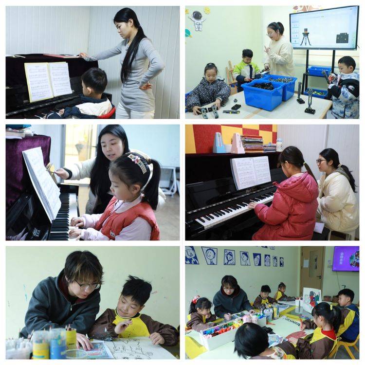 书法课上,老师弯腰纠正孩子的握笔姿势,用趣味故事讲解汉字起源,让枯燥的笔画练习变得生动有趣;乐高课上,老师用“你真棒”“再试试”的暖心话语,驱散他们的紧张与不安;美术课上,每个孩子的奇思妙想都被珍视,哪怕是看似“杂乱”的线条,也能得到“这是你独特的表达”的肯定回应。钢琴课上,老师们不仅关注指法、节奏等技术细节,更注重音乐感知与情感表达的引导,让孩子们在黑白旋律中,收获快乐、成就梦想……