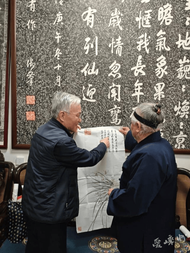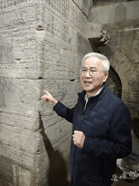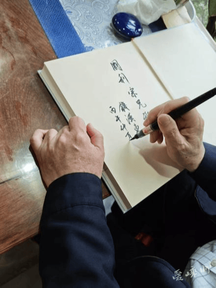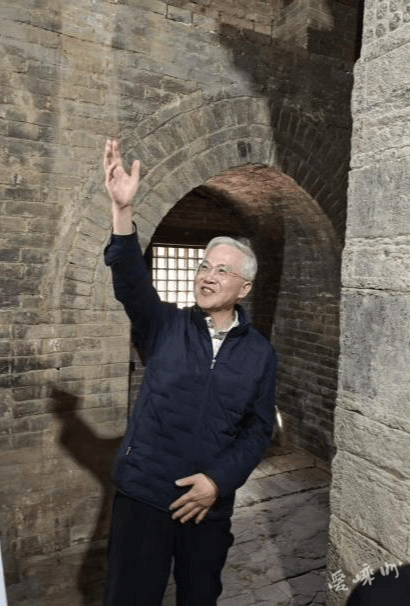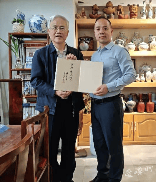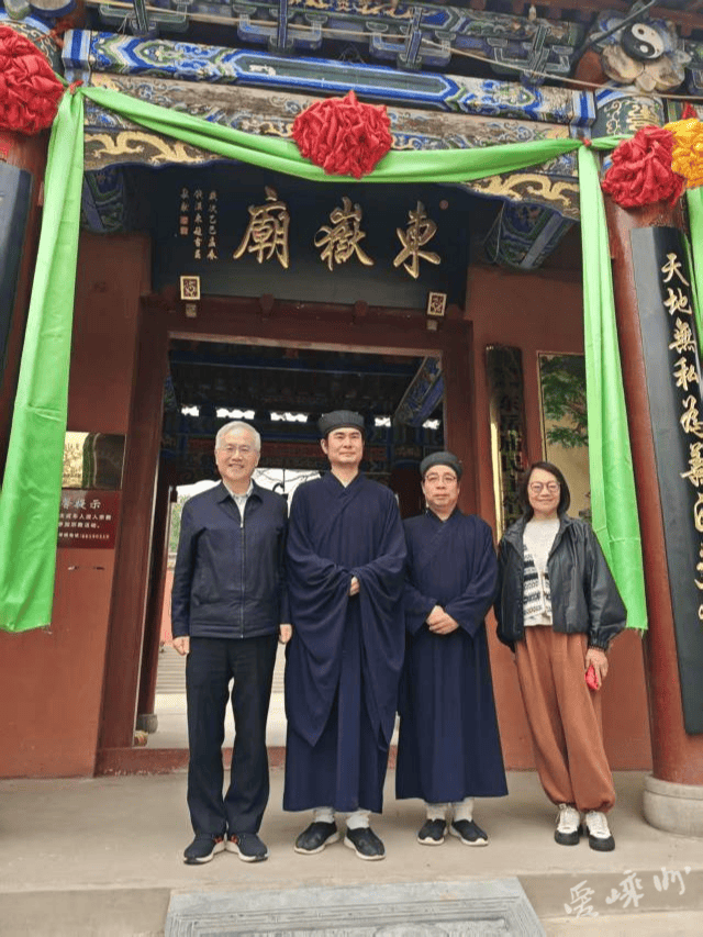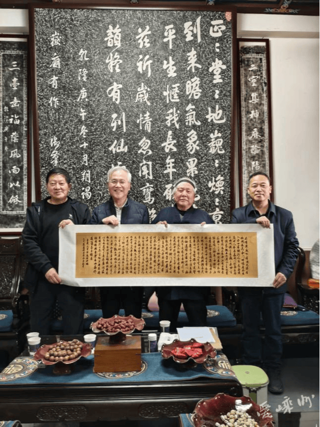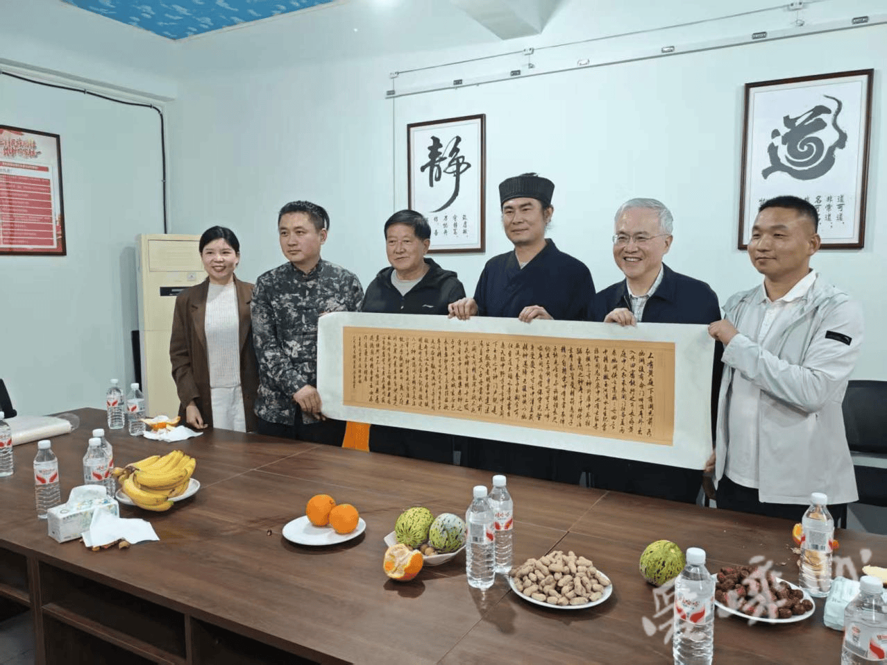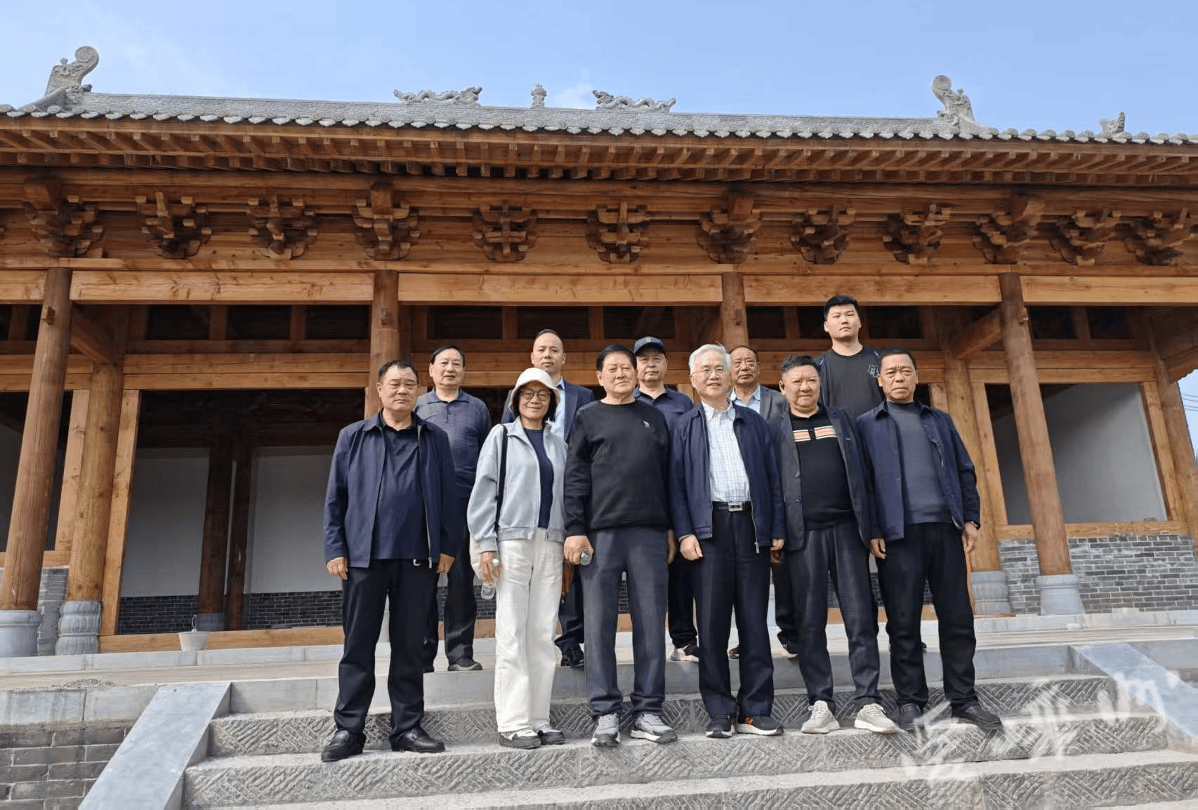 首站抵达郑州航空港区东岳庙。山门之上,先生亲笔题写的“东岳庙”匾额黑底金字,笔力遒劲,融端庄厚重与笔墨灵动气韵于一体,在日光下熠熠生辉。先生缓步其间,目光拂过古建飞檐、碑刻残石,对记载明代重修的残碑俯身细辨,指尖轻拂浮尘,似与百年历史轻声对话。谈及匾额,他只谦逊一笑:“不过是尽一份对传统文化的心意,庙宇真正的价值,在于信仰的延续与文化的传承。”寥寥数语,尽显学者的淡泊与赤诚。其间,汉东教授还向东岳庙赠送了书法作品。 中原之行,先生身负使命而来。次日便奔赴洛阳孟津小良村,实地探访钱氏先祖钱弘俶埋葬之地。他与当地政府、村民促膝长谈,为祖茔营建、太平广场建设倾囊献策,擘画方略。深厚学识与开阔眼界,让在场宗亲豁然开朗。于他而言,寻根不仅是追念过往,更是为家族文脉接续薪火。